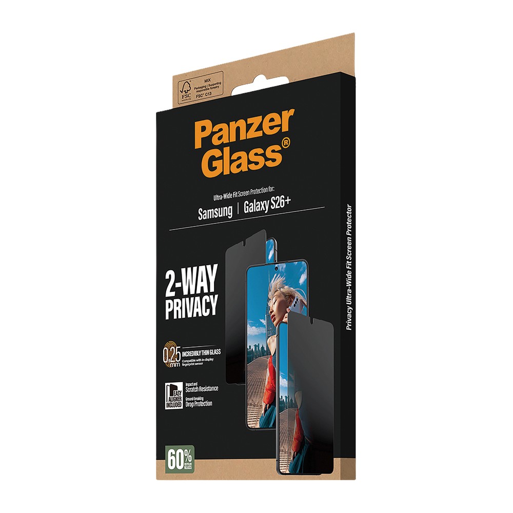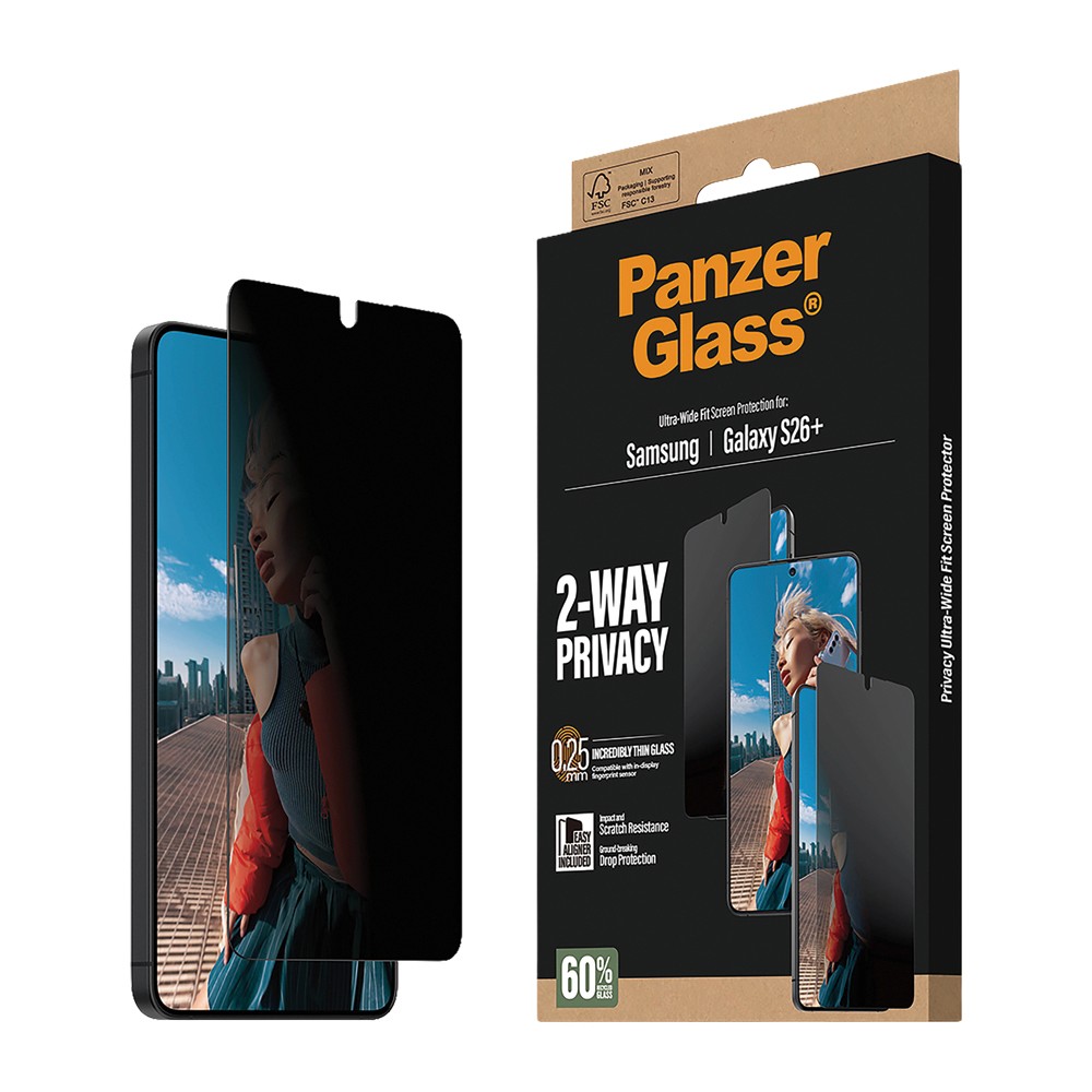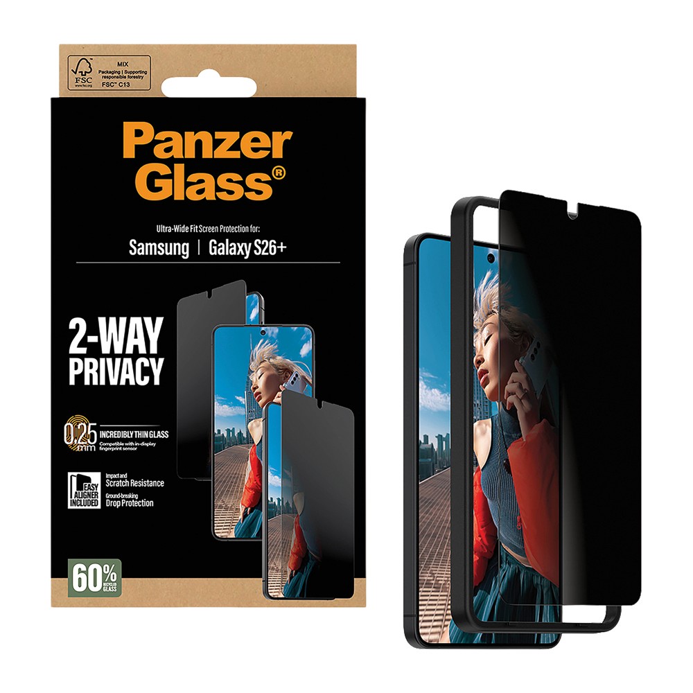 Protect your screen and your privacy with the PanzerGlass 2-Way Privacy Screen Protector for Samsung Galaxy S26+. The built-in privacy filter keeps your display invisible from the sides, so only you can see what's on screen. Ultra-wide coverage, scratch and drop resistance, and the included EasyAligner make for a complete, easy-to-install solution.