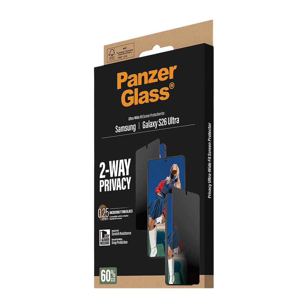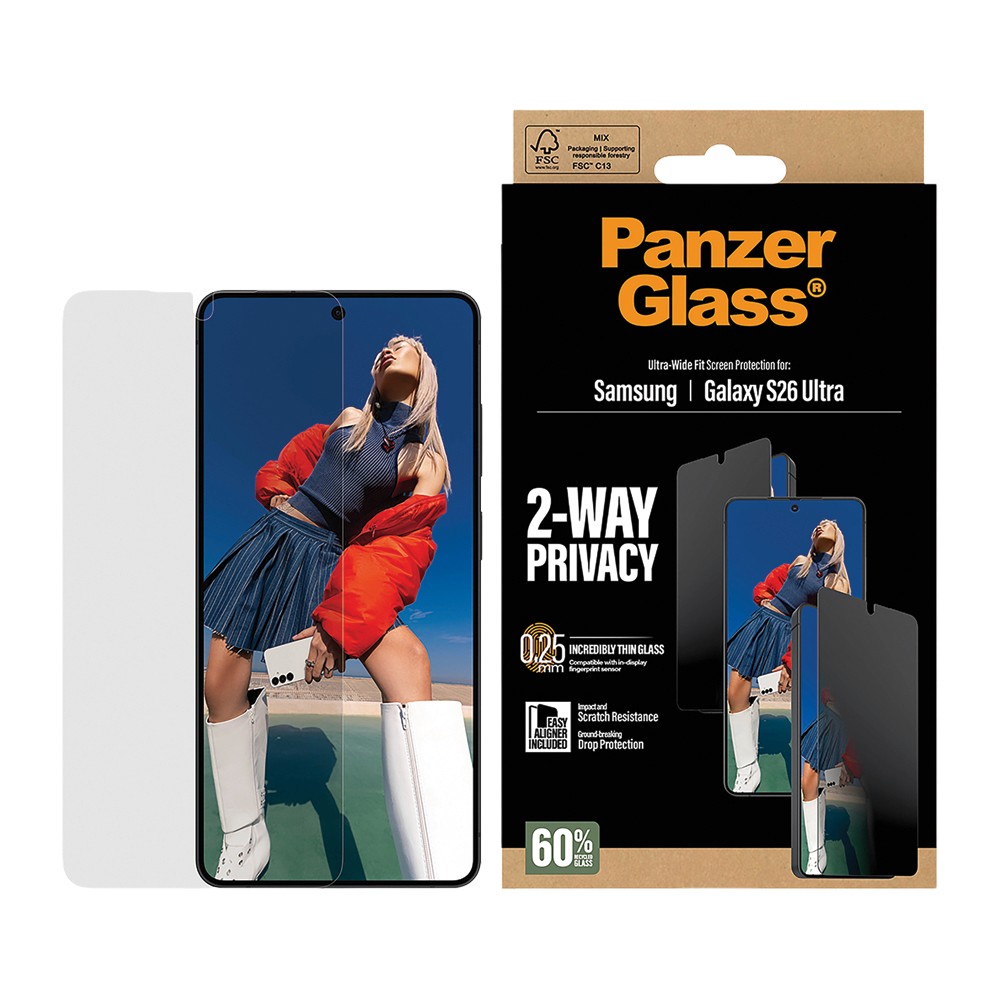 Protect your screen and your privacy with the PanzerGlass 2-Way Privacy Screen Protector for Samsung Galaxy S26 Ultra. The built-in privacy filter keeps your display invisible from the sides, so only you can see what's on screen. Ultra-wide coverage, scratch and drop resistance, and the included EasyAligner make for a complete, easy-to-install solution.