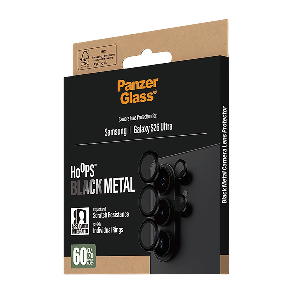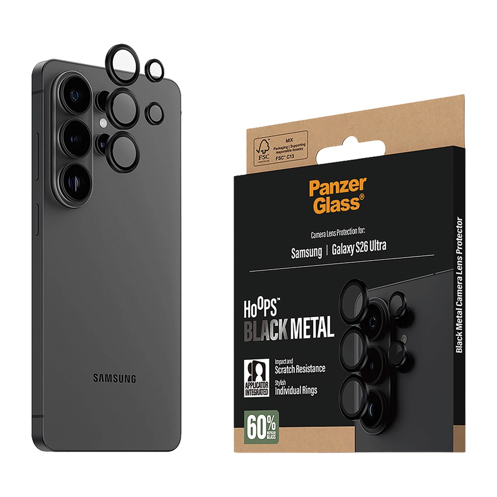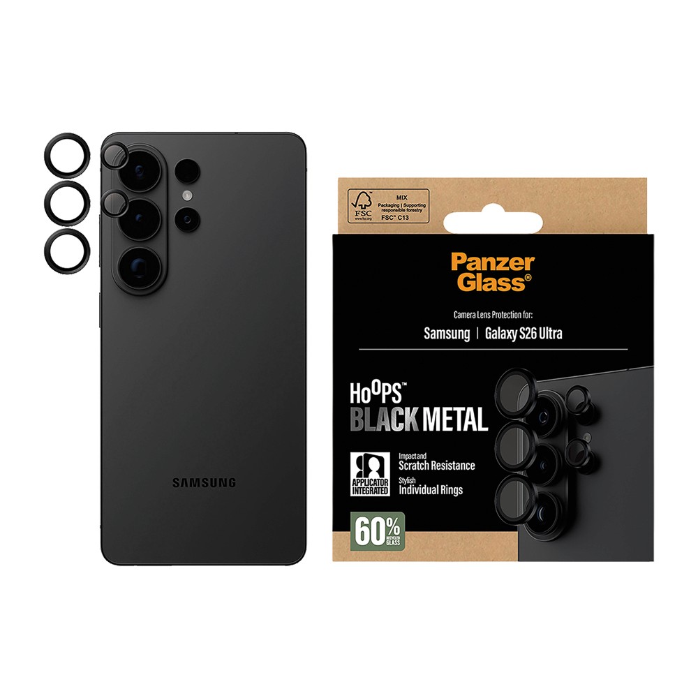 Protect your Samsung Galaxy S26 Ultra camera lenses with PanzerGlass Hoops in Black. These slim rings feature a sleek black metal frame and are made from scratch- and shock-resistant glass, providing robust lens defense without sacrificing clarity. The adhesive edges and included mounting tool make application quick and precise.