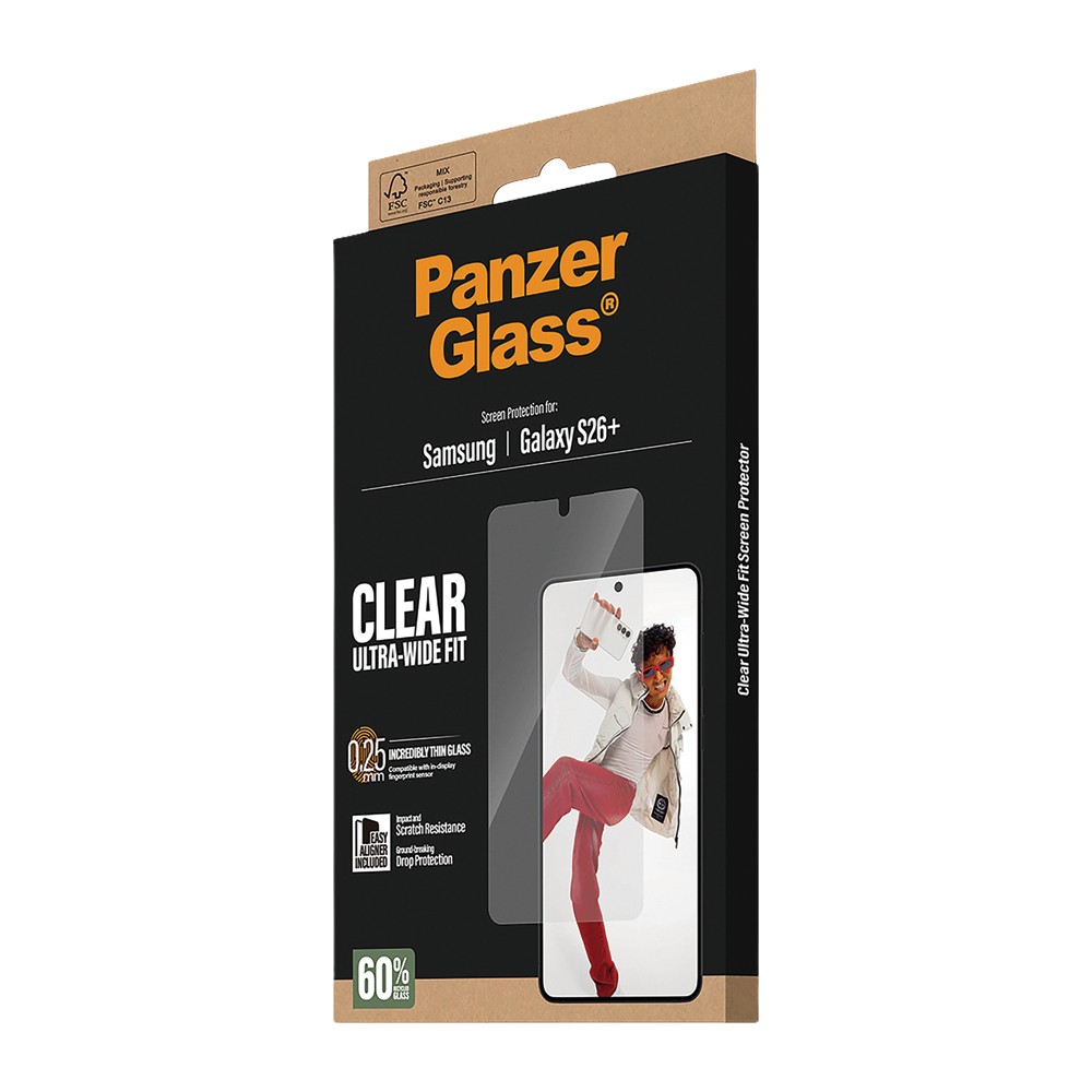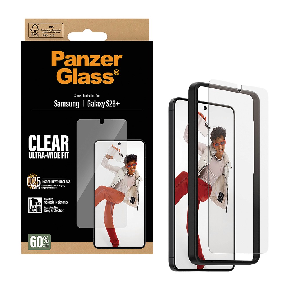 Keep your Samsung Galaxy S26+ screen protected with the PanzerGlass Screen Protector. Made from 60% recycled glass, it delivers ultra-wide coverage, high scratch and drop resistance, and maintains full touch sensitivity. The included EasyAligner makes installation precise and bubble-free every time, while the FSC™-certified packaging keeps things eco-friendly.