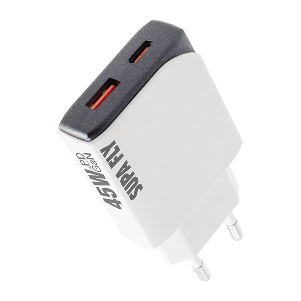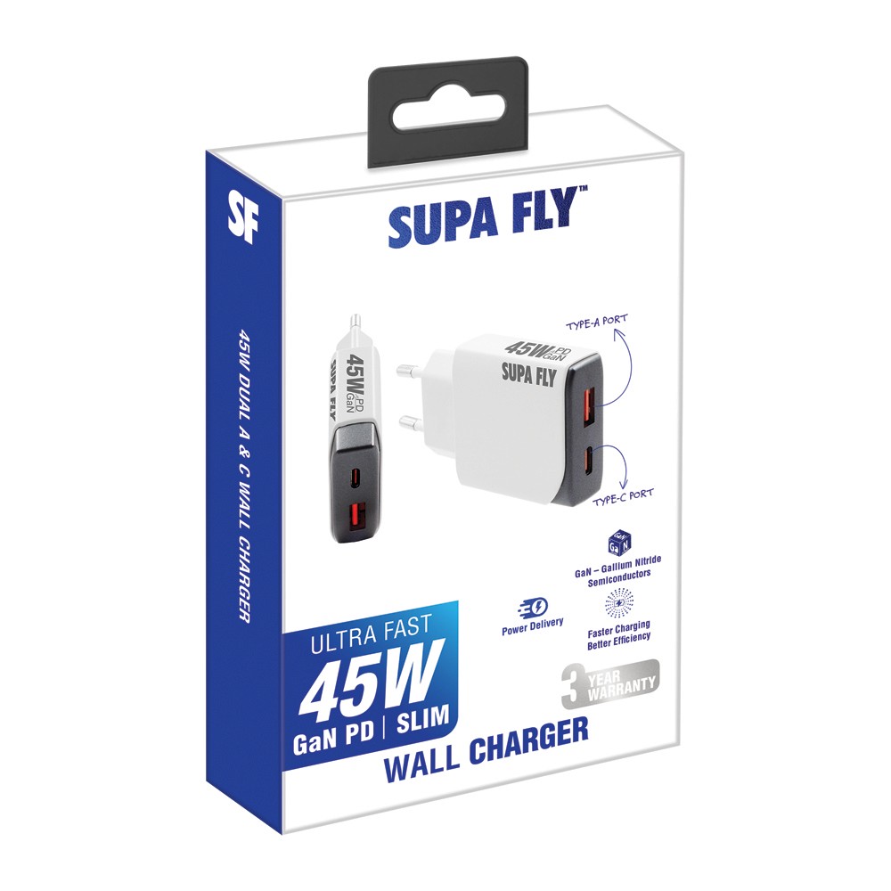 The Supa Fly 45W Dual A + C Port Slim Wall Charger is your compact all-in-one charging solution. With a sleek ultra-thin design and dual outputs, it delivers fast, efficient charging powered by GaN, PD, and PPS technology. Perfect for smartphones, tablets and more
