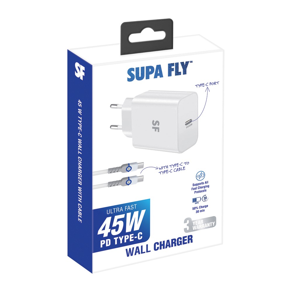 The Supa Fly 45W PD Type-C Wall Charger with Type-C to Type-C Cable is your complete solution for ultra-fast, intelligent charging. Featuring Power Delivery and PPS support, it adapts its output based on your device’s needs. Delivering up to 45W of optimized power. Ideal for smartphones, tablets, and select laptops. The included 1.2m Type-C to Type-C cable is built to handle up to 45W and over 10,000 bends, durable enough for daily use and powerful enough for high-performance charging.