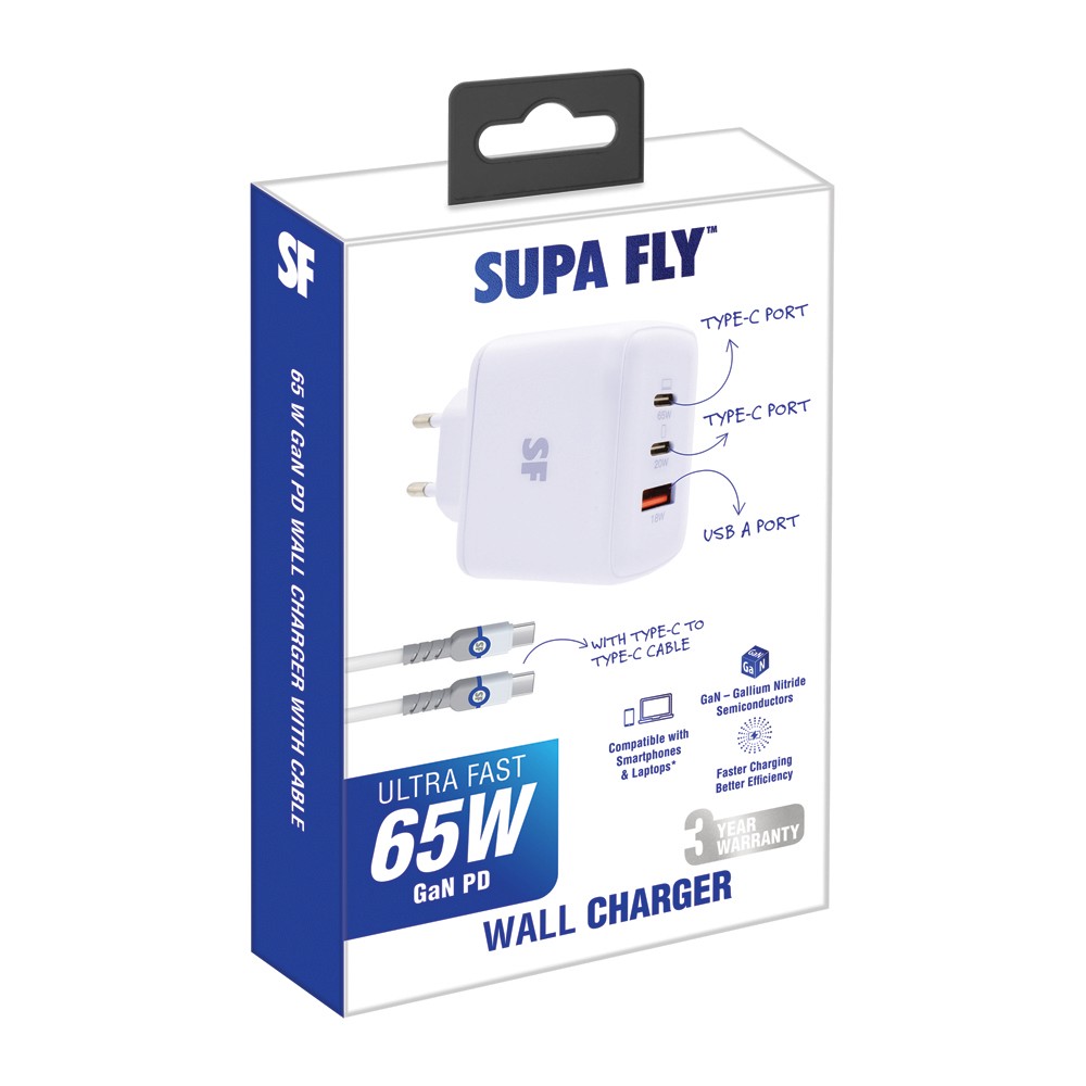 Designed to provide fast and efficient charging for your devices. With its 3 port 65 watt output, this charger delivers quick and reliable power. The USB A and Type-C ports make it compatible with most cables, providing you with the flexibility to charge multiple devices at once.