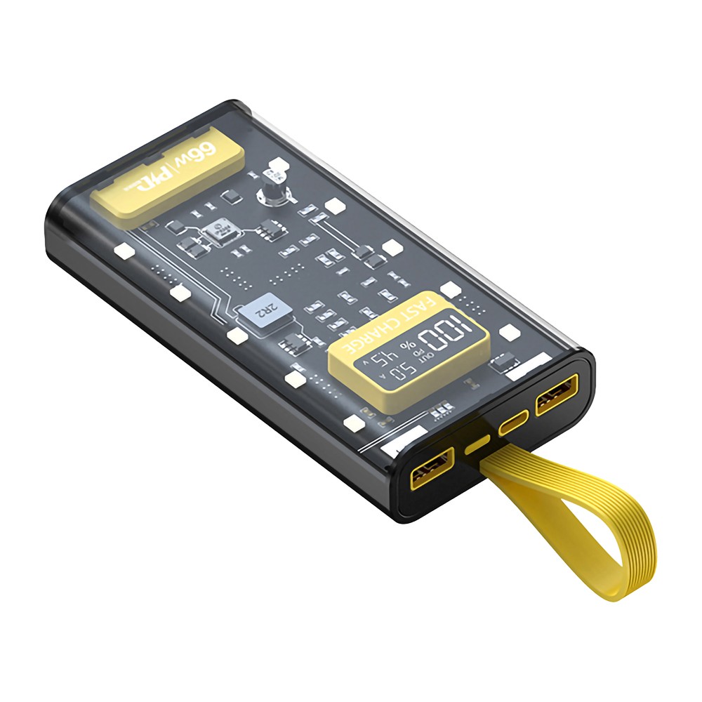 Charge in style with this transparent 22.5W PD 10 000mAh Power Bank. With 3 output ports and smart voltage adjustment, it powers multiple devices efficiently. The LCD screen displays battery life and charging rate, while built-in LED lights offer 3 brightness settings. A sleek design with circuit protection ensures safe, fast charging on the go.