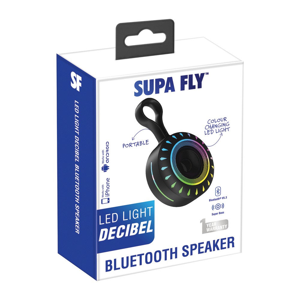 Amp up your vibe with the Supa Fly Decibel Bluetooth Speaker. Compact yet powerful, this portable speaker delivers rich bass and clear sound packed in a stylish design. Featuring Bluetooth 5.3 for stable wireless connectivity, vibrant colour-changing LED lights, and fast Type-C charging, it’s perfect for on-the-go music lovers who want to bring the party anywhere. Enjoy up to 3 hours of playback and lightweight portability for effortless use anywhere you go.