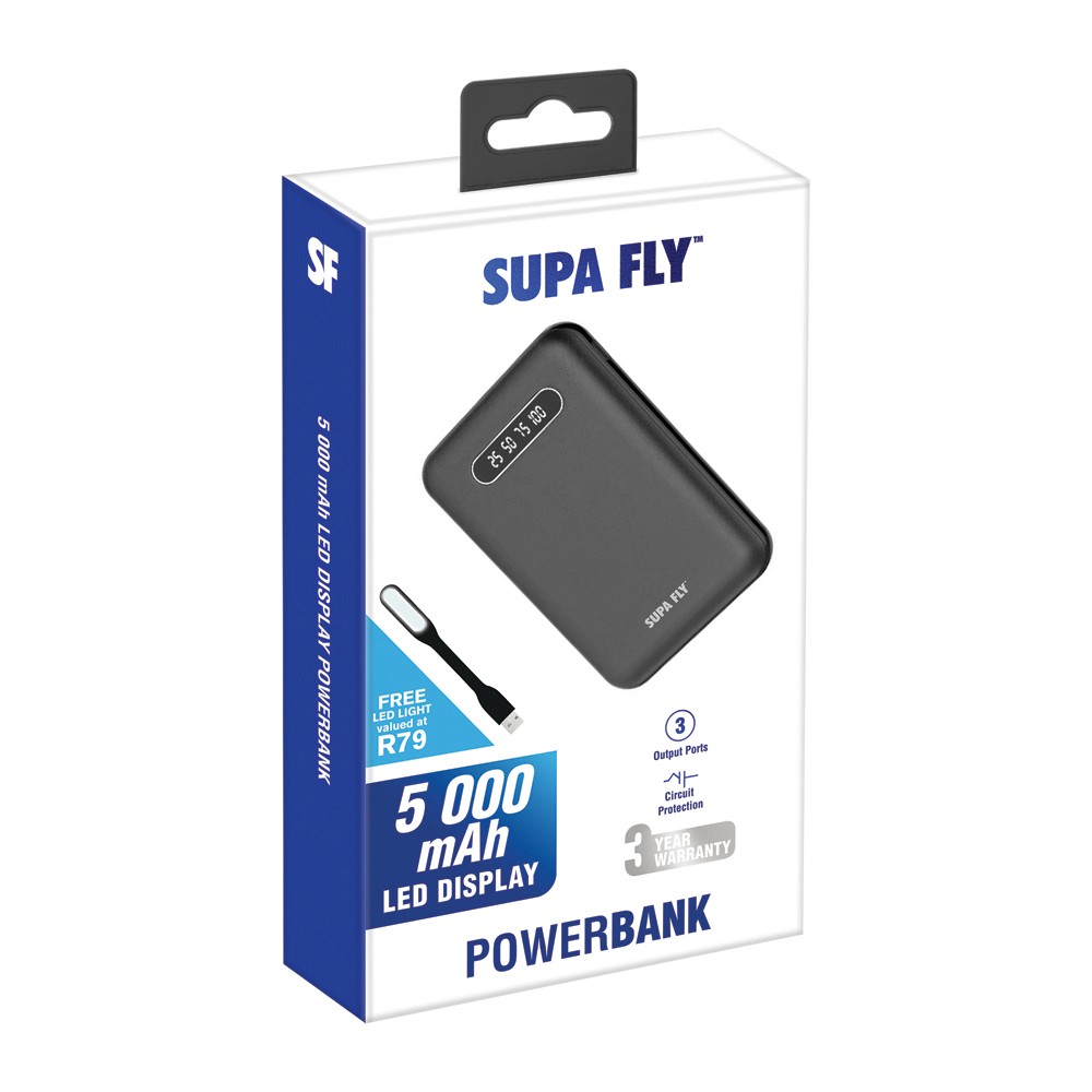 This 5 000mAh Power Bank is ideal for daily use. It also has a safe circuit design to prevent over-charging, short-circuit and over-discharge. It comes with an LED display and an activation button. With 2 x USB, 1 x Type-C and 1 x Micro ports, this Power Bank has a sleek and stylish design and is ideal for charging your phone and other devices. The Power Bank includes an LED indicator that displays the remaining charge level.
