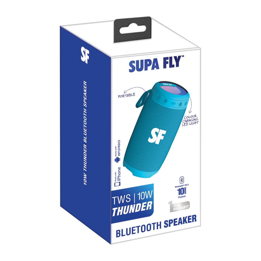Feel the boom with the Supa Fly Thunder Speaker, designed to pump up any space with powerful dual drivers, vibrant colour-changing LEDs, and up to 10 hours of wireless playback. Featuring Bluetooth 6.0 for stable connection, TWS pairing, and a compact body with IPX4 splash resistance, it’s built for music lovers on the move. Charge quickly with Type-C and let the sound follow you, wherever you go.