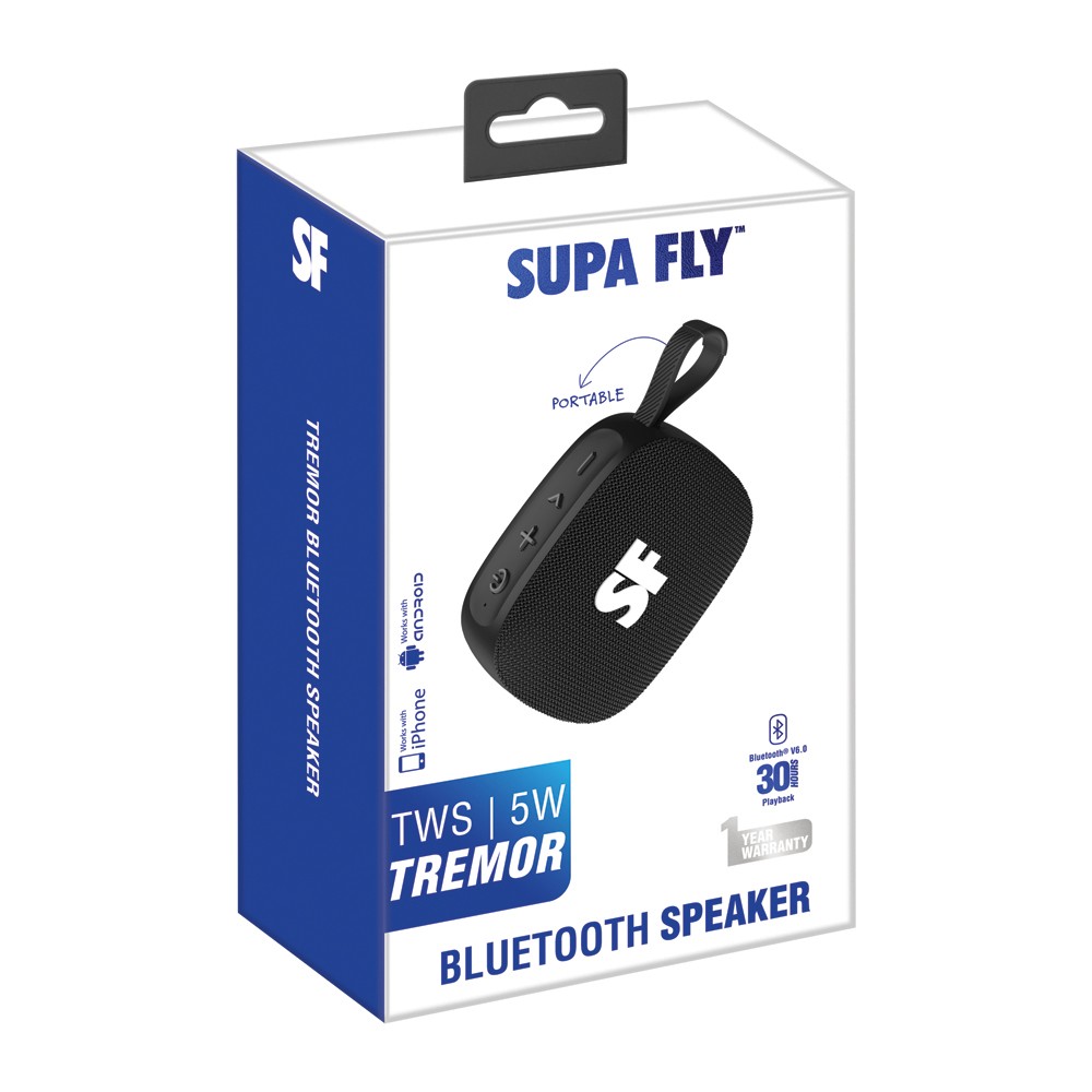 Take your sound anywhere with the Supa Fly Tremor Speaker. With powerful 52mm drivers and Bluetooth 6.0 connectivity, this portable speaker delivers full, immersive audio in a compact design. Built for everyday adventures, it supports TWS pairing, AUX and Micro SD playback, and boasts up to 30 hours of playtime. Its splash-resistant IPX4 rating and modern Type-C charging keep you connected no matter where the music takes you.